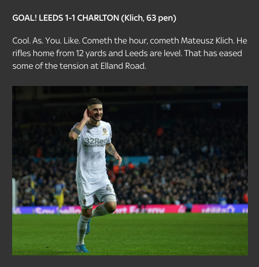 Thankfully, Mateusz Klich came up with a penalty after 63 minutes to ease the Elland Road nerves. With a superior goal difference over Forest, Charlton would have to score again or Forest would need to beat Stoke to deny Leeds promotion and to save themselves from relegation.
