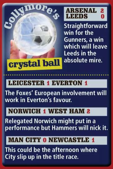 “Straightforward win for the Gunners, a win which will leave Leeds in the absolute mire,” said Collymore via the Sunday People [8 May, page 40].