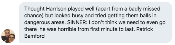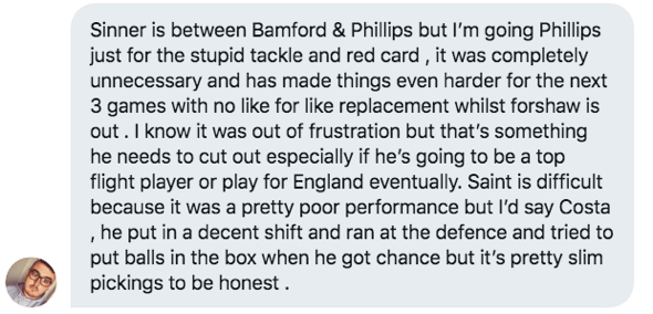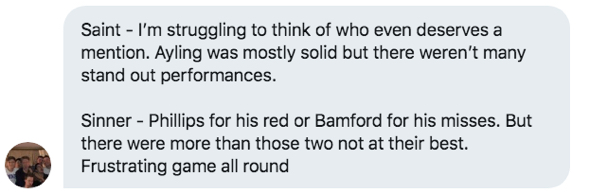We were expecting to see Phillips get the most votes for Sinner after his stupid red card. However, Bamford and his penalty miss take centre stage with Waz saying he was “horrible from first minute to last”.
