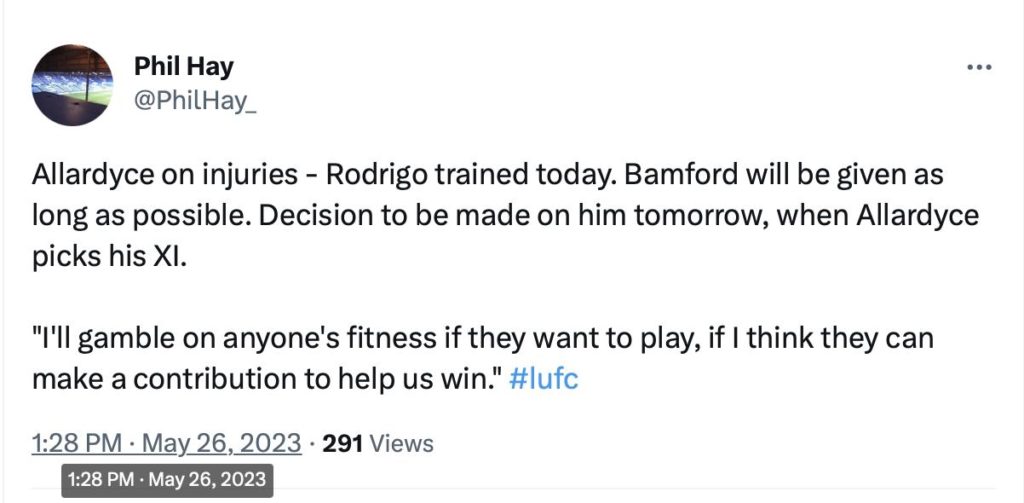 Allardyce has since revealed in his latest press conference that Rodrigo has trained ahead of the clash against Spurs and that a decision on Patrick Bamford will be made tomorrow.