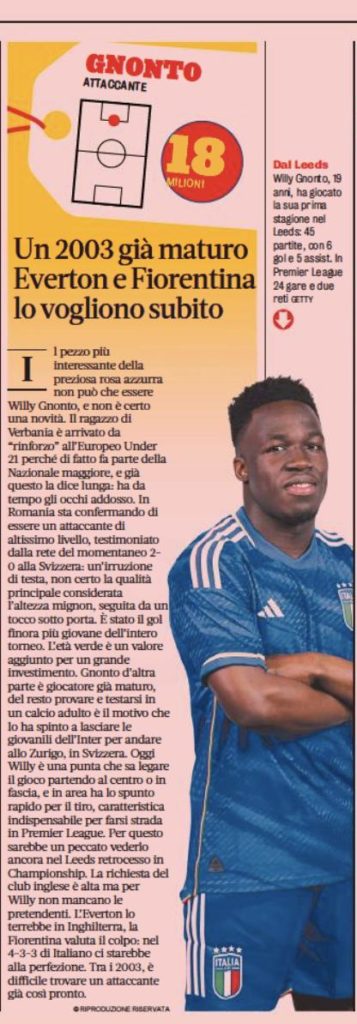 The newspaper states [27 June, pg 10] that although Leeds’ demands for Gnonto are high, Everton and Fiorentina remain interested, with the former keen to keep him in England and the latter desiring to see him back in his home country of Italy.