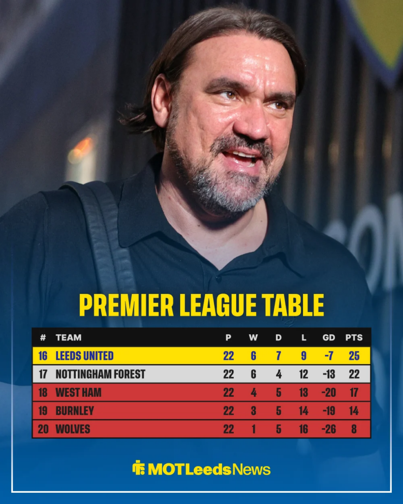 Leeds host league leaders Arsenal and relegation-threatened Nottingham Forest in their next two home games. If they can win some of these, their safety may be all but assured.